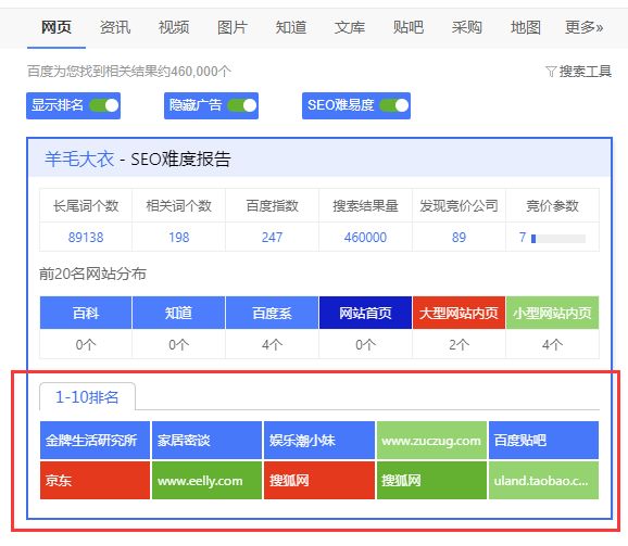该表格让我们一眼能够看出整个页面上SEO的分布情况,大站有多少个,百度自身网站有多少个,小型网站有多少个,小型网站内页越多,那么机会就越大,特别是做霸屏的SEO工作者非常需要这类数据。
