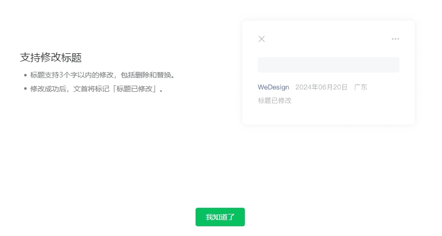 7月9日消息,根据微信公众号后台提示,现支持标题3个字以内、正文20个字以内的修改。若修改标题,文首还会显示“标题已修改”。修改后的标题将在文章页、公众号主页、用户新收到的分享卡片中生效。