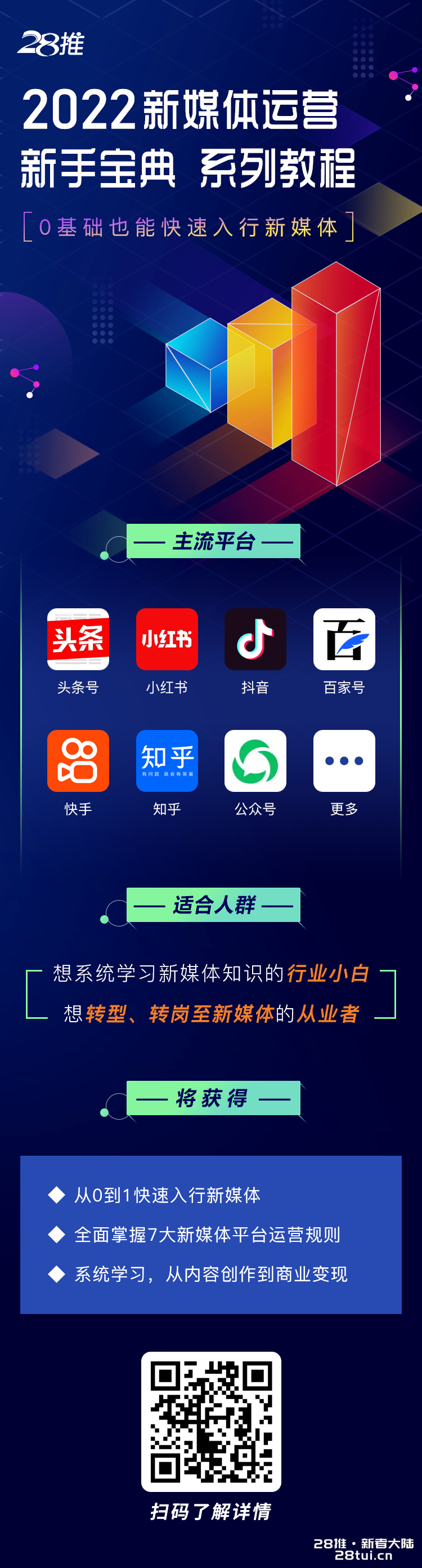 28推做新媒体算下来也10多年了,是行业里面的“老人”了,28推新者大陆更多的也是为新媒体的从业者和初学者提供一个学习、交流的平台。针对新手入行新媒体无从下手的问题,新者大陆的官方工作人员为此也是整理、编辑了新媒体行业7大主流平台的系列教程,专门针对0基础入行新媒体难的问题。