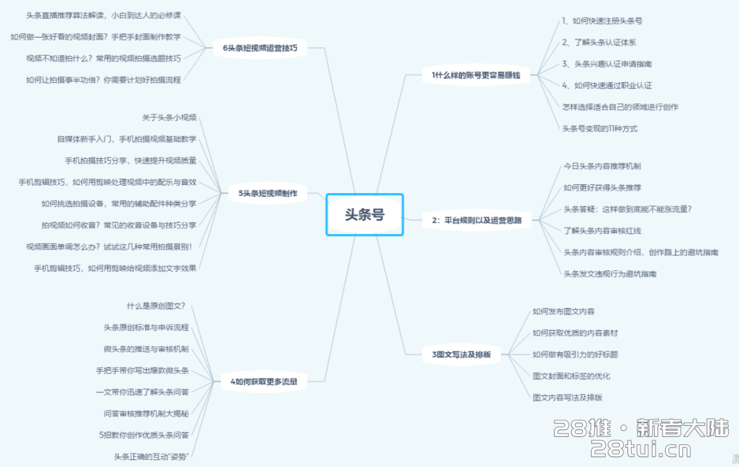 新者整理的头条号系列教程包含了账号打造、平台规则、运营思路、内容创作技巧、流量密码、头条短视频制作、头条短视频运营等几大核心内容。
