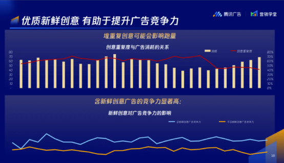 针对这些问题我们来一一解答,首先是第一个:老广告会不会有头部效应?比如之前有几个创意跑量效果特别好,如果继续上新创意,会不会存在创意挤压的情况?新创意还能不能起量?我们需要明确一点:新创意是跟整个大盘中的创意做竞争,而不是只跟广告里的个别创意竞争,所以不会因为老广告中有跑量好的创意,就导致新创意没量。关于头部效应这个问题,在几个月前其实还比较常见的,但是随着3.0系统的算法的变化,新创意在老广告下还是能跑出效果的。对于优化师而言,还是要去适应新的算法,大家如果认知还停留在几个月之前,担心头部效应,不敢在老广告中上新创意实在是没必要,可以尝试在老广告中新建创意,毕竟平台也会有流量扶持,还能借助以往创意的历史数据,何乐而不为呢?拉长周期来看,广告不可能不衰退,如果你不上新创意,那就一定会被上新的广告挤压,你不上别人肯定会上,所以既是正在跑量的广告,也要不断地测试新创意。以前我们可能为了增加创意数量,加快效率,会出现很多重复的创意,其实从大盘数据来看,当重复创意的比例增多的时候,广告整体的拿量能力会下降。从平台的角度来看,平台是在引导大家不要上重复的创意,如果上重复的创意,平台很大概率会过滤掉,所以上重复创意本质上是个无效的动作。而且从上面截图中我们能发现,如果广告中有新创意,会比没有任何新创意的广告,竞争力会高很多,所以只有在尝试新创意的时候,才有机会拿到更多的量级。