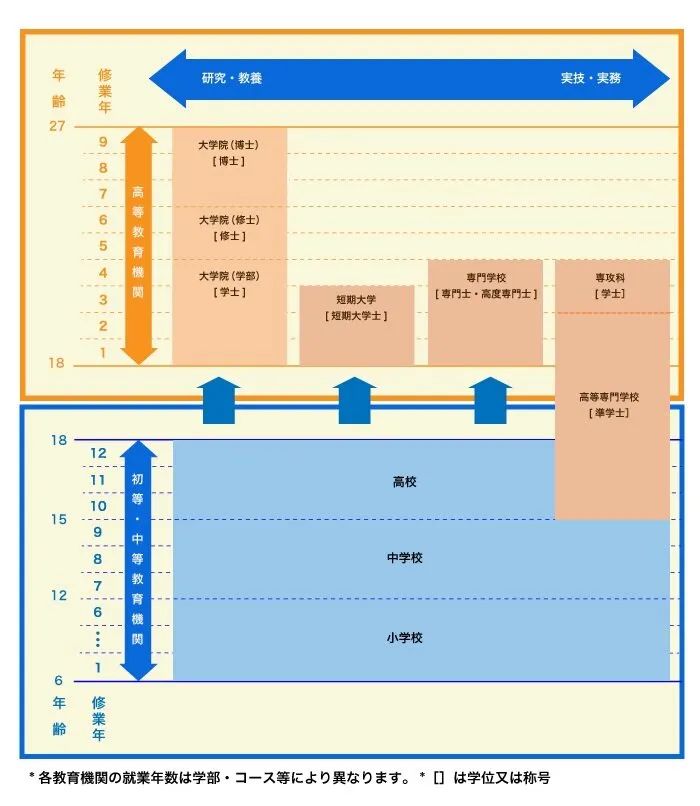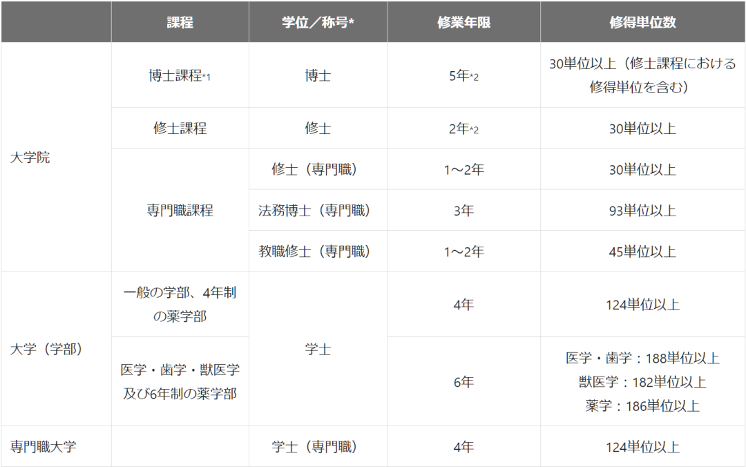 *1 大学院博士课程有可能分为前期课程(2年)和后期课程(3年)的情况。学士课程的学习年限为6年的医学、齿学、兽医学、药学(6年制),博士课程的学习年限为4年。