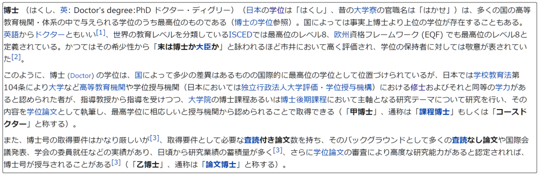 “博士”是所有学位中的最高称号。日本的博士课程学制通常为3年,医学、齿学、兽医学的博士课程学制通常为4年。博士课程申请者只限于具有硕士学位,或被承认具有同等学习能力者。