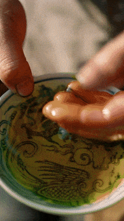 再加入少量的金粉、朱砂、龙脑、珍珠粉、麝香等,一起搅和。