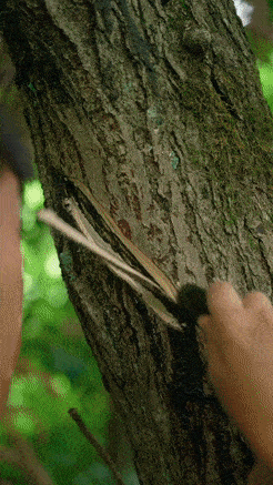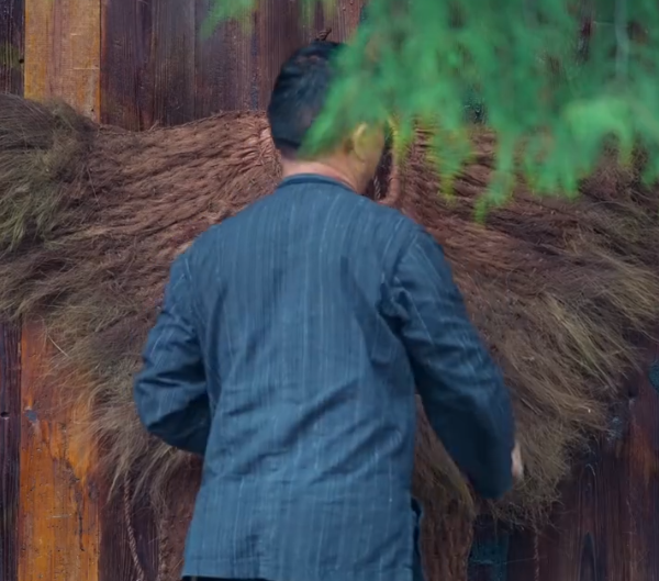 视频一开场,茂密的山林里,一位小伙子从漆树划开一道口。