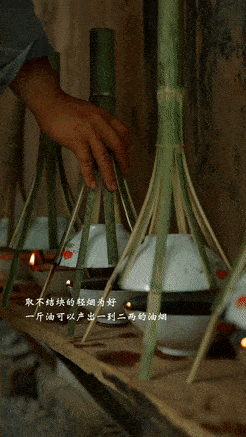再把它盛在碗里,用竹夹固定好,点燃灯芯,慢慢炼出油烟。