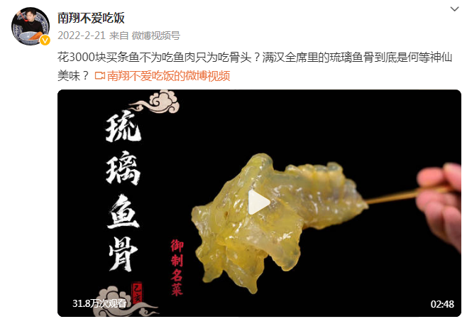 依靠“宫廷御菜”在全网走红的@南翔不爱吃饭。
