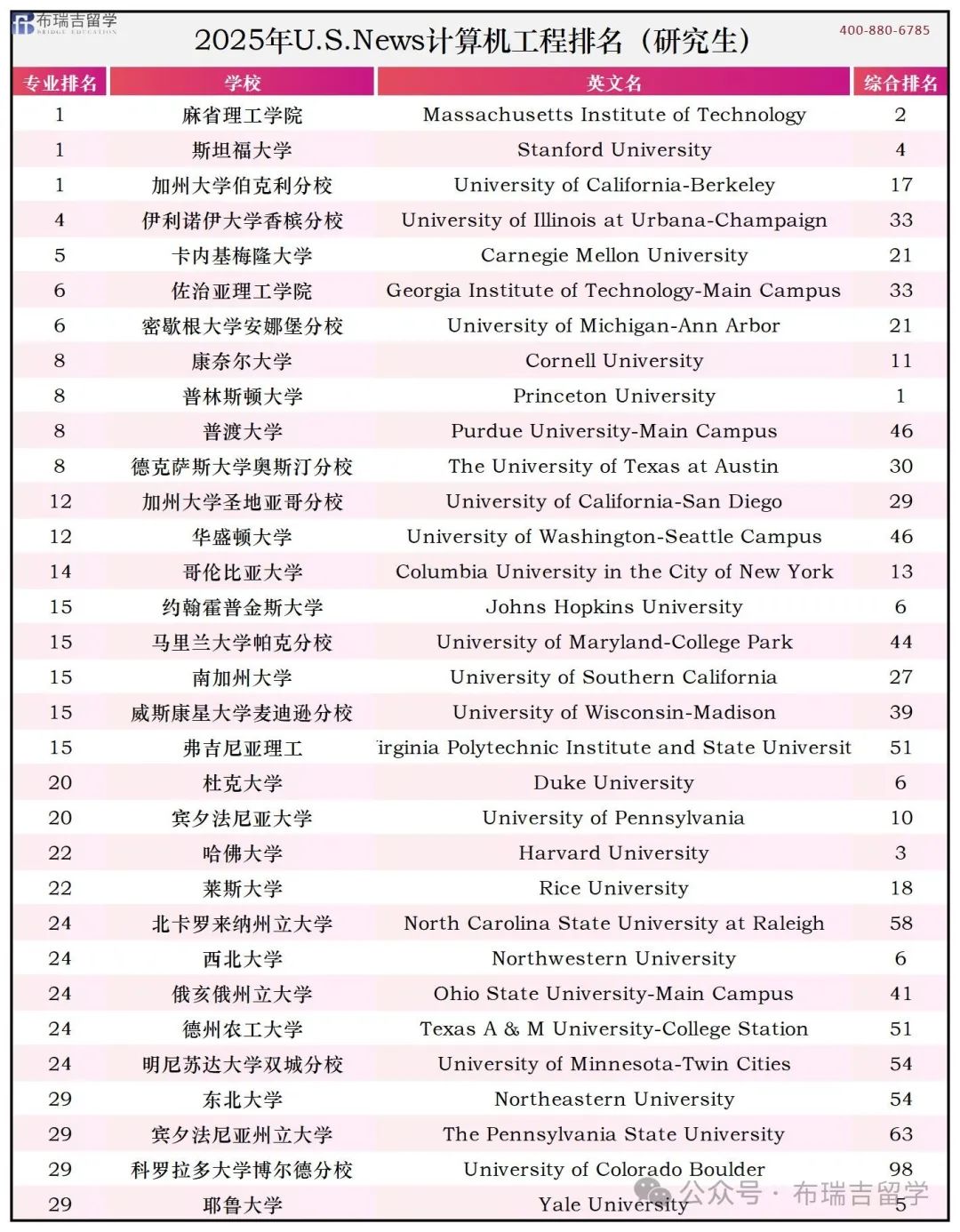 在此排名中,Cornell、UCLA、Umich、UC Berkeley 等名校稳居前列。布瑞吉留学专注美国名校规划申请,帮助众多学生成功入读这些顶级学府。