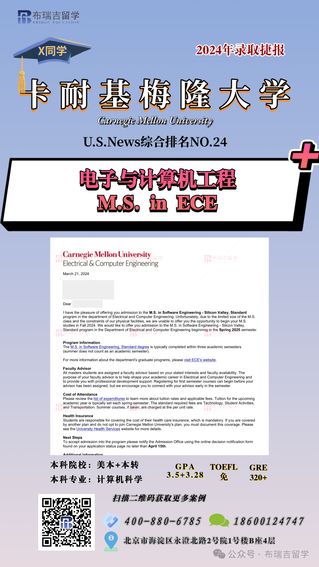案例回顾: 布瑞吉留学帮助一位学生校完成本科后,通过精细的背景规划与材料打磨,获得了CMU和UCSD的计算机工程硕士录取,并获得奖学金支持。
