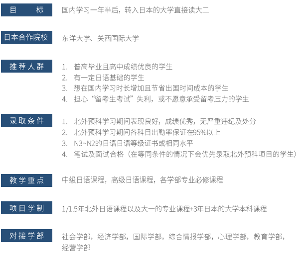 在语言基本功方面,培养学生"听、说、读、写、译"全面发展的日语能力,在专业技能方面,开设日本语言学、日本文学、日本文化、日本经济等领域的研讨课,为培养学生的专业水准的学术素养打下基础:北外的日语教师团队为日语预科项目的打下坚实的教学基础。
