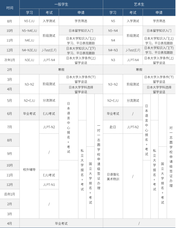 周一到周五都上课,总计900课时,每月进行考试,内容包括笔试、听力和口语。让学生在最快的时间内,完成日语本科学生4年的教学进度。