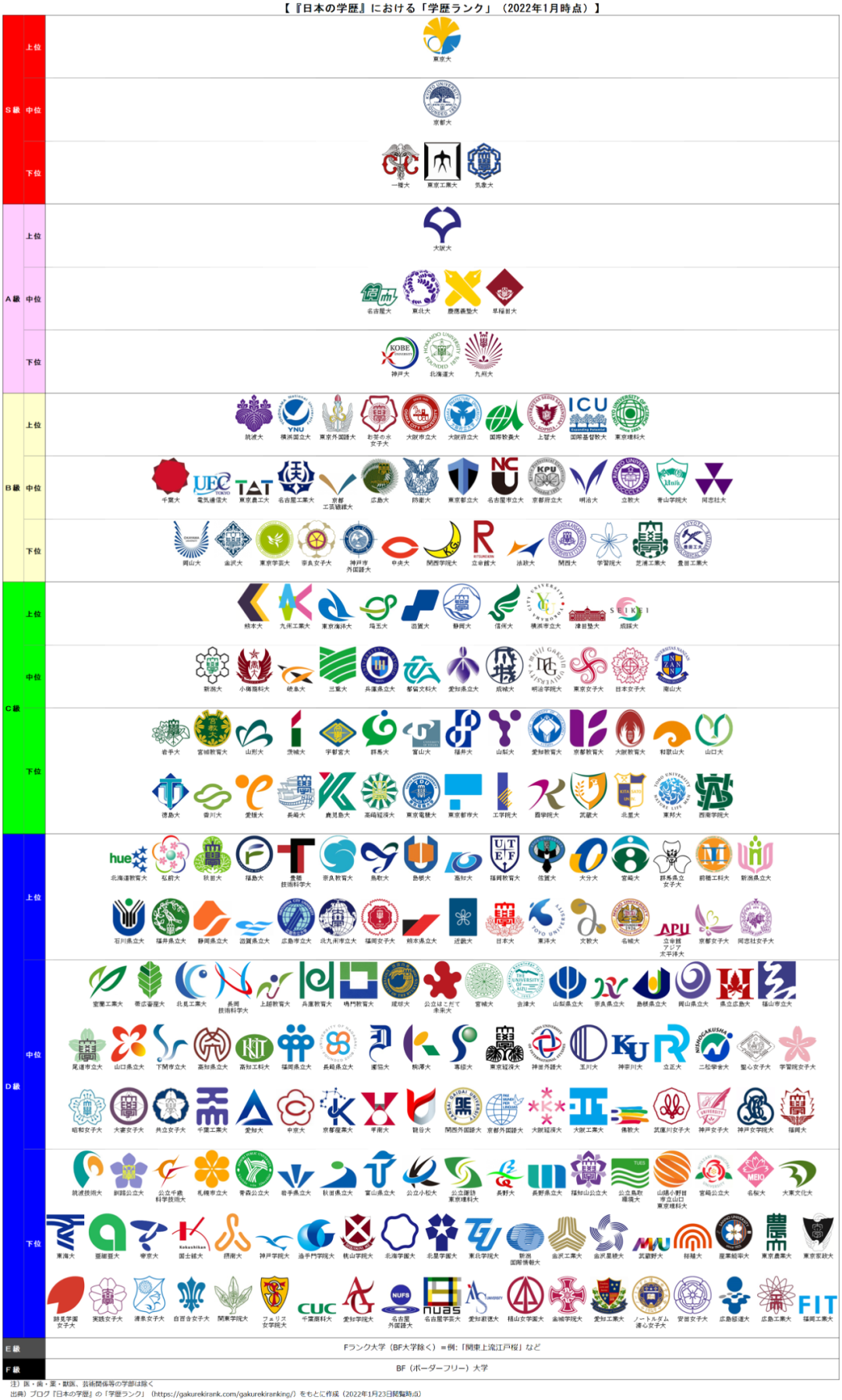 3.在日本的社交网络上,会有人将MARCH以下的大学群视为F级大学,如果按照这个分类标准,日本大部分学校都被归位F级,不太符合现实,并且这种分类标准具有嘲讽、中伤的感觉,所以一般都不需要太在意。