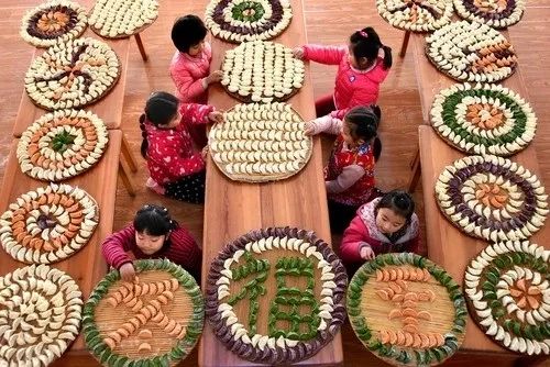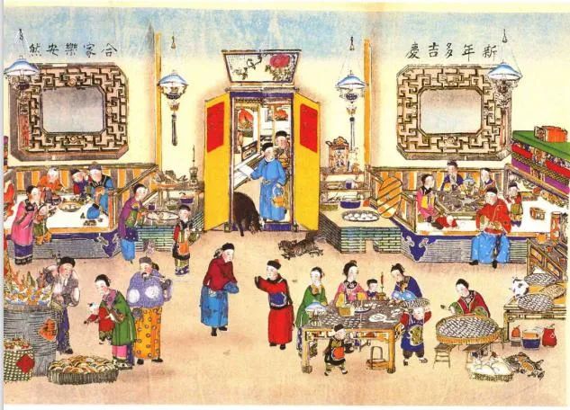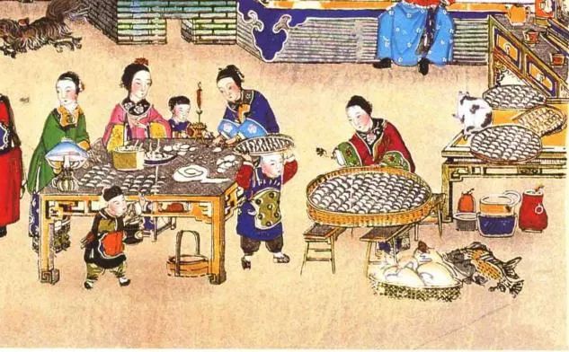 ▲清代天津杨柳青年画 《新年多吉庆 合家乐安然》 局部。(图片来源:《中国民间美术全集·装饰编·年画卷》)饺子分为饺皮和饺馅。饺皮除了用麦面、米面之外,《清稗类钞》还记载过蛋饺,比较差则用荞面。车王府藏《跳墙全串贯》戏本就提到过“荞面角子”。明人无心子的《金雀记》中就有“与你一个黑溜偢荞麦的饺饵”的念白。饺子馅更是多种多样,最大限度考验着制作者的匠心。明人高濂《遵生八笺•饮馔服食笺》“甜食类”所谓的“水明角儿法”,乃是烫面甜饺的制作方式。在《金瓶梅》中,西门庆问王婆一家店卖什么食物,王婆回答:“他家卖的拖煎河漏子,干巴子肉翻包着菜肉匾食饺……”这种匾食饺主要原料有干把子肉、鲜肉和菜。而在《红楼梦》中,贾母跟丫头们吃饭,一个小捧盒内是“一寸来大的小饺儿”,因馅是用螃蟹做的,贾母嫌其油腻,故此没有吃。清人吴士鉴写有《椴木饺》的诗,并提及宫中有五月食椴木饺的风俗,椴即木槿。车王府藏《探亲全串贯》戏本也提到荞麦荠菜饺子,现在西安的荠菜饺子比较出名。据《王韬日记》载,方鹤楼的鸡肉饺吸引王韬多次前往。《符璋日记》提到一种饺子,馅用瓠子、虾仁、火腿,切碎炒熟,用生猪油拌着蒸,味道可口。中华民族对于饺子的重视可谓无以复加。老舍在《北京的春节》中说:“腊八这天还要泡腊八蒜。把蒜瓣在这天放到高醋里,封起来,为过年吃饺子用的。”也就是说,从制作腊八蒜开始,北京人对春节饺子的期待已经提上了日程。在广袤的中华大地上,饺子的形制“五花八门”,饺子的制作不断“推陈出新”,东北酸菜饺子、吉林冰花煎饺、陕西酸汤水饺、湖北金鱼饺、江苏火饺、浙江蛋饺、广东虾饺和四川钟水饺等知名度越来越高,是饺子中的佼佼者。东北满族及赫哲族的鱼肉水饺、朝鲜族的肉汤饺和狗肉大饺子“满德固”、甘肃裕固族的羊肉冻饺、新疆尔族的羊肉饺子等,也为全国人所熟悉。满族人将饺子称为“哎吉饽饽”。除夕半夜子时,家家吃饺子,取“更岁饺子”之意,还要放一枚金银锞子、宝石、铜钱等,寓意终岁大吉。满族对饺子的形状非常在意,那就是必须要有褶子,光边的“和尚头”饺子有日子过秃了的不详预兆。其次,满族人对摆放饺子也非常讲究,必须得横竖成行,寓意四通八达。不能摆放成圈,因为那样预示着日子没有门路。(山东将饺子摆成圆形,呈放射壮,称为圈福,还有做99个饺子的说法,取长久之意。)满族大年初一吃团圆饺子,俗称“揣元宝”。煮饺子时主人问:“小日子起来了吗?”其他人一起回答:“起来了。”饺子从锅底浮起来,寓意日子好起来。除了过年吃饺子之外,满族婚嫁也要煮水饺。这时忌讳说“熟”字,而说“生”字,寓意生育。达斡尔族称春节为阿涅。大年三十傍晚,达斡尔族人点燃篝火,老人们将大块的肉、馍、饺子等食物抛进火堆,祝福人畜安康、五谷丰登。除夕,则家家吃饺子,饺子里有白线,寓意长命百岁。按照锡伯族的习俗,除夕一家人包饺子,等到五更时分,才能煮饺子,名曰辞岁饺子,这是一年最为隆重的时刻。吃完饺子后睡觉,取一年安饱之兆。以前,往往是在重大节庆时刻才能吃到饺子,在餐馆吃饺子更是想都不敢想的事。随着生活方式的提升,饺子已经变成了平常食物,其精神意义逐渐取代了物质意义。
